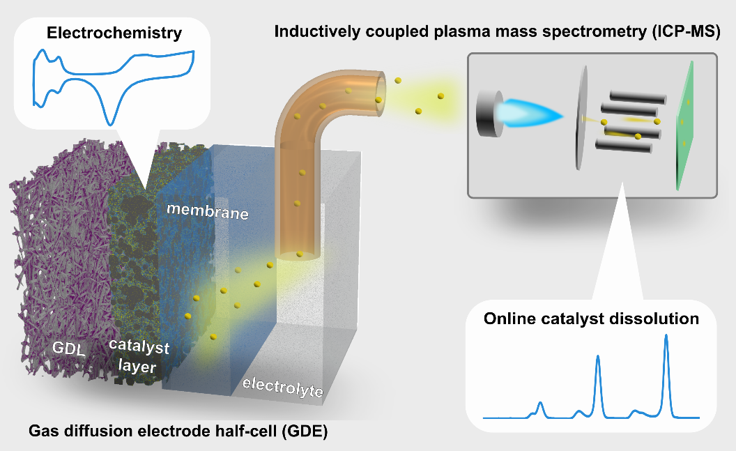 Our new work on Pt dissolution in realistic fuel cell catalyst layers was published in Angewandte Chemie. In this current work we present the first experimental approach to measure Pt dissolution in gas diffusion electrodes (GDE). Therefore we coupled our GDE half-cell setup with inductively coupled plasma mass spectrometry (ICPMS). With this, Pt dissolution in realistic catalyst layers and the transport of dissolved Pt species through Nafion membranes are evaluated directly.