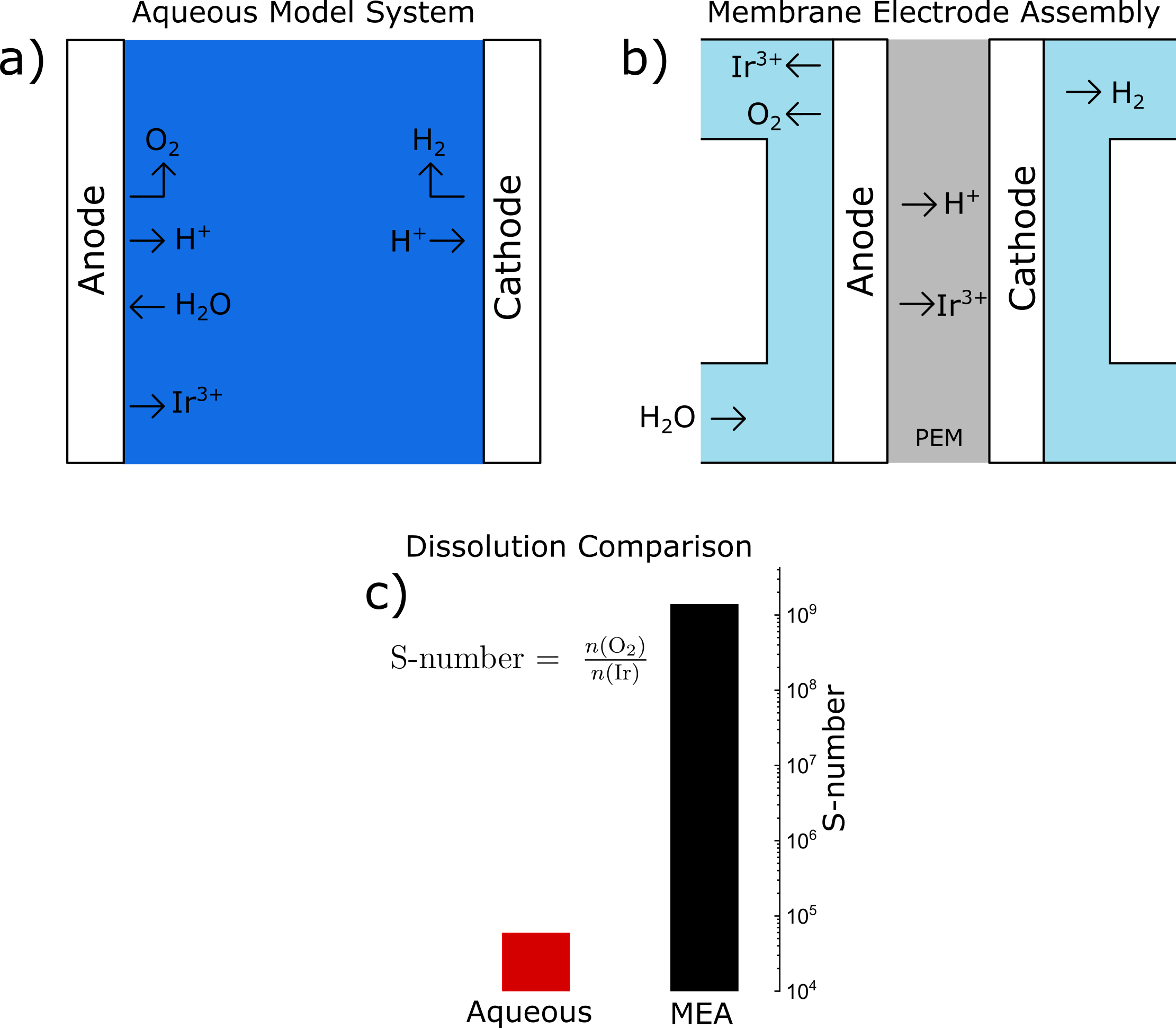 Our results indicate two main contributors being responsible for the dissolution discrepancy—first, a general overestimation of the acidity of the conditions in the MEA. Second, iridium oxide stabilizes in the MEA system on longer timescales.