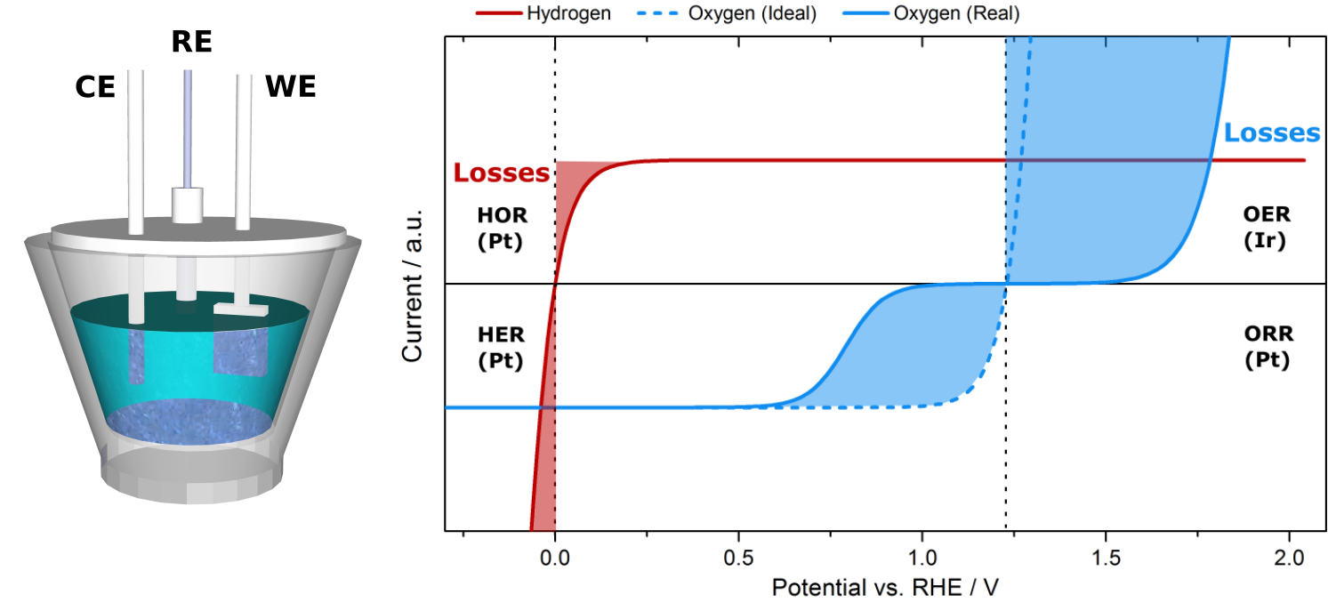 With a gas diffusion electrode (GDE) set-up it is possible to combine the advantages of fundamental methods such as RDE (only small amount of catalyst needed for testing, simple cell configuration enables fast, low-cost and well-comparable testing) with those of more applied catalyst testing methods like MEA-testing (large potential window enabled by high mass transport, realistic catalyst layers and loadings). Thereby the activity of electrocatalysts in a current density range up to 2 A cm-2 can be evaluated.