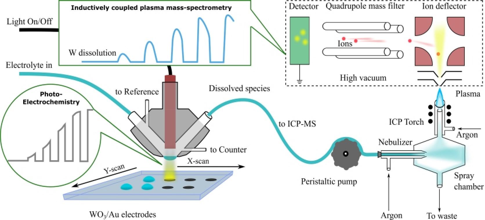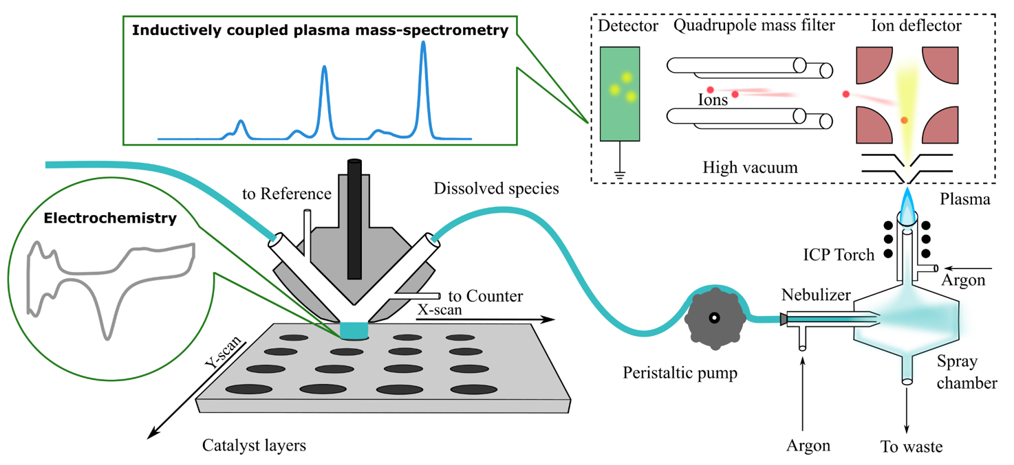 The coupling of a scanning flow cell to an inductively coupled mass spectrometer allows for the online detection of electrochemically dissolved metals. A variety of in-house cell designs allows for the application to a variety of materials. Solid metals, gradient alloys or dropcast catalyst inks are placed on a movable stage underneath the cell, allowing for rapid scanning from one measurement to the next.