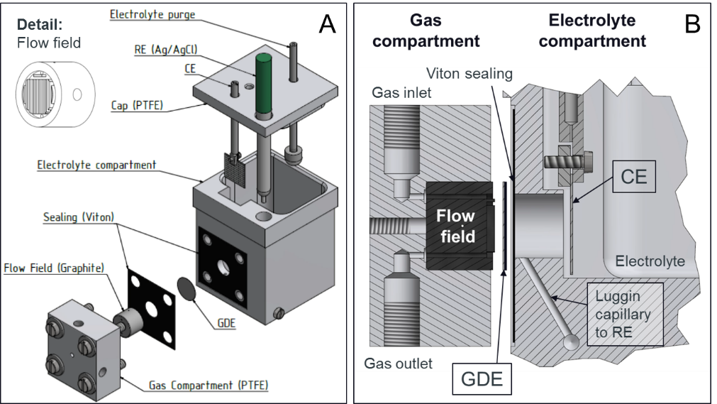 In electrochemical three-phase reactions, such as the fuel cell reactions or CO2-reduction, research in aqueous electrolytes (RDE, SFC i.e.) is limited due to diffusion limitation of dissolved educts to the electrode surface. To evaluate electrocatalysts for those reactions in high-current ranges, which are close to realistic application conditions, different techniques have to be considered.