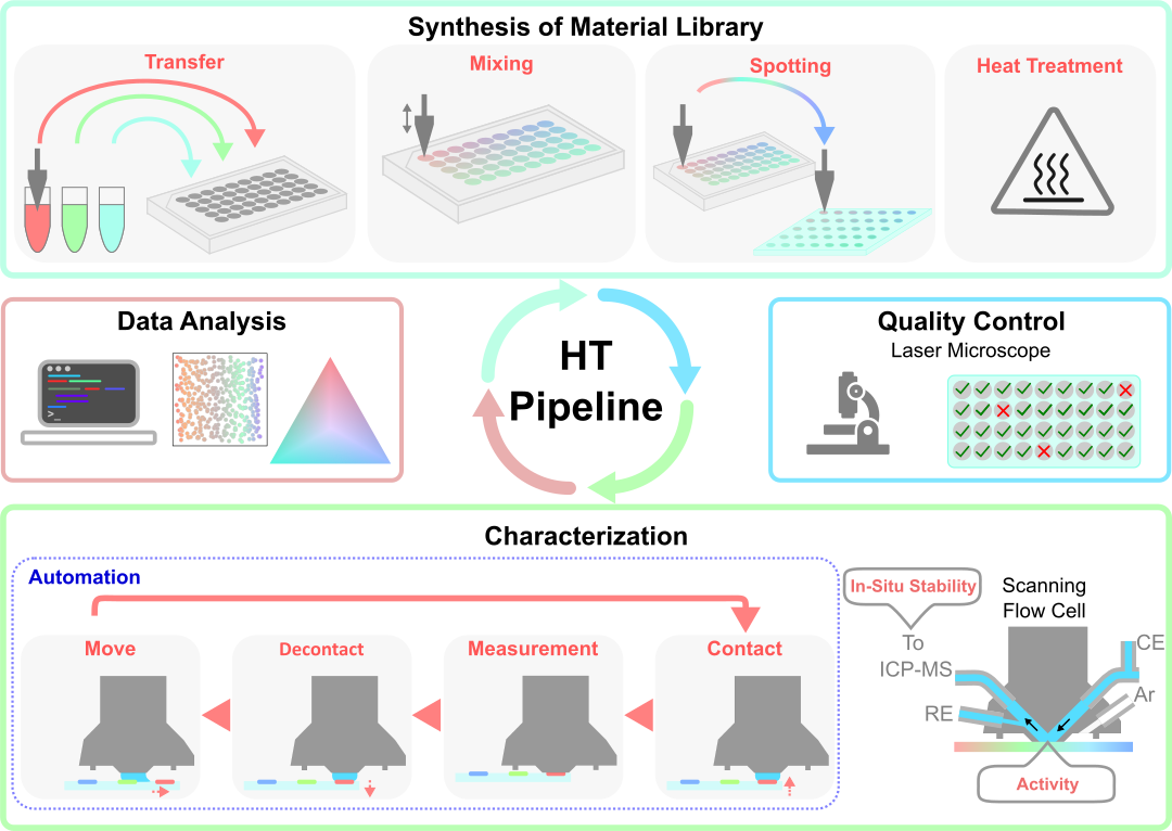 The high-throughput catalyst libraries synthesis methods are combined with automated physicochemical characterization (ICP-MS, XPS, EDS, XRF, laser microscope, etc.) and fast electrochemical screening with SFC-based techniques.