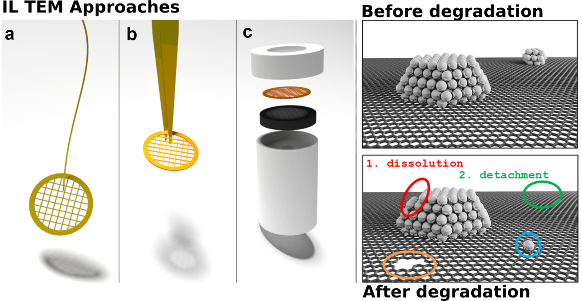 Following the initial TEM visualization, the sample can then be loaded into an electrochemical system for performing the experiments of interest. The TEM grid can be freely suspended in the electrolyte (connected via a wire or tweezer), incorporated into an rotating disc electrode tip, or assembled into a testing fuel cell membrane electrode assembly.