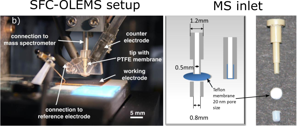 On-line electrochemical mass spectrometry (OLEMS) or differential electrochemical mass spectrometry (DEMS) is a technique used in electrochemistry for time- and potential-resolved analysis of gases or volatile species formed on the working electrode. In typical OLEMS/DEMS cells a gas transparent membrane is used to divide the electrochemical environment from the high vacuum of a mass spectrometer. Most cells are stationery. By attaching gas MS to an SFC, however, this technique can be used in the fast scanning mode. This allows utilization of SFC-OLEMS in both fundamental research (e.g. identification of IrO3 intermediate during oxygen evolution reaction on Ir electrodes) and high-throughput electrochemistry (e.g. screening CO2 reduction selectivity towards CH4 and C2H4 on CoCu gradient libraries).