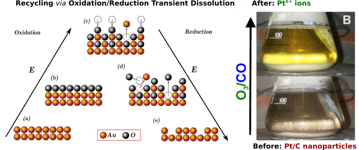 Disruptive in most electrochemical processes, dissolution can also be useful. The so-called transient dissolution which takes place during noble metals oxidation and reduction can be employed in recycling of noble metals. In this process, metal oxidation and reduction is achieved by repetitive enrichment of an electrolyte with oxidative, e.g. ozone, and reductive, e.g. hydrogen, gases or liquids. Unlike traditional hydrometallurgical processes, recycling via transient dissolution can be performed at relatively mild conditions, i.e. low base or acid concentration, room temperate, etc.