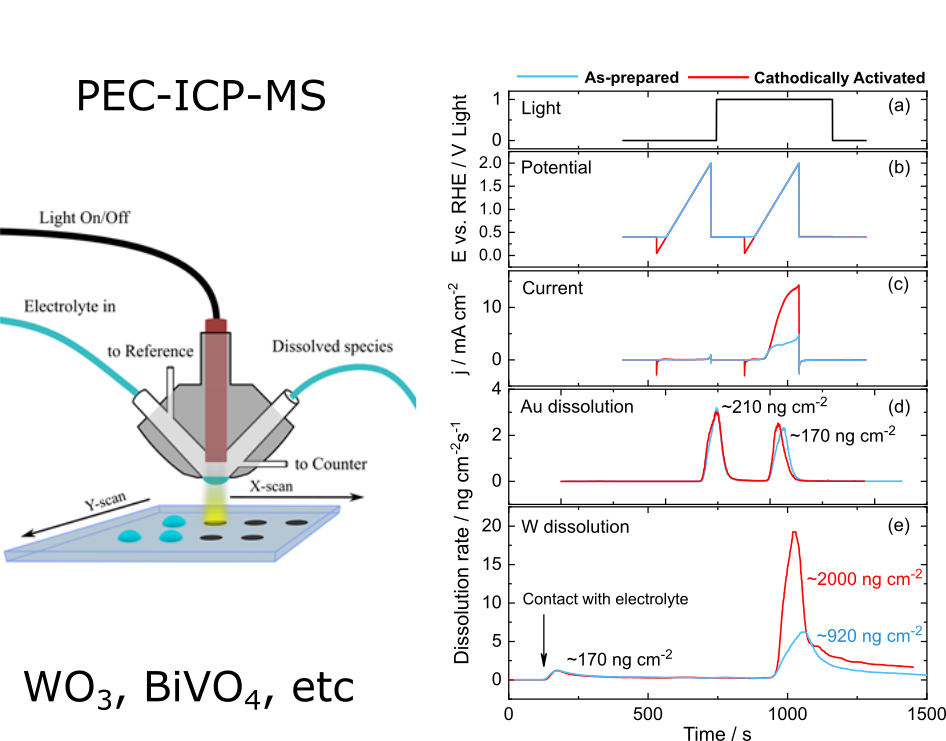 Photoelectrochemical water splitting is considered as an alternative technology to classical harvesting electricity by photovoltaics and hydrogen production water splitting in electrolyzers. Even though technological, environmental or economical advantage of this technology is still to be proven, stability of photoabsorbers and electrocatalysts during photoelectrochemical water splitting is of great scientific interest. Our group recently demonstrated that even materials typically considered as stable, suffer from dissolution. Thus, due to high anodic potential of the photogenerated holes and presence of complexing sulphate ions in electrolyte, WO3 photoanodes dissolve severely during light illumination. Moreover, dissolution was found to scale with main anodic current. Currently, we concentrate at understanding WO3 photocorrosion and its dependence on different electrolytes, presence of hole scavengers in electrolyte, presence of electrocatalyst such as Ir.